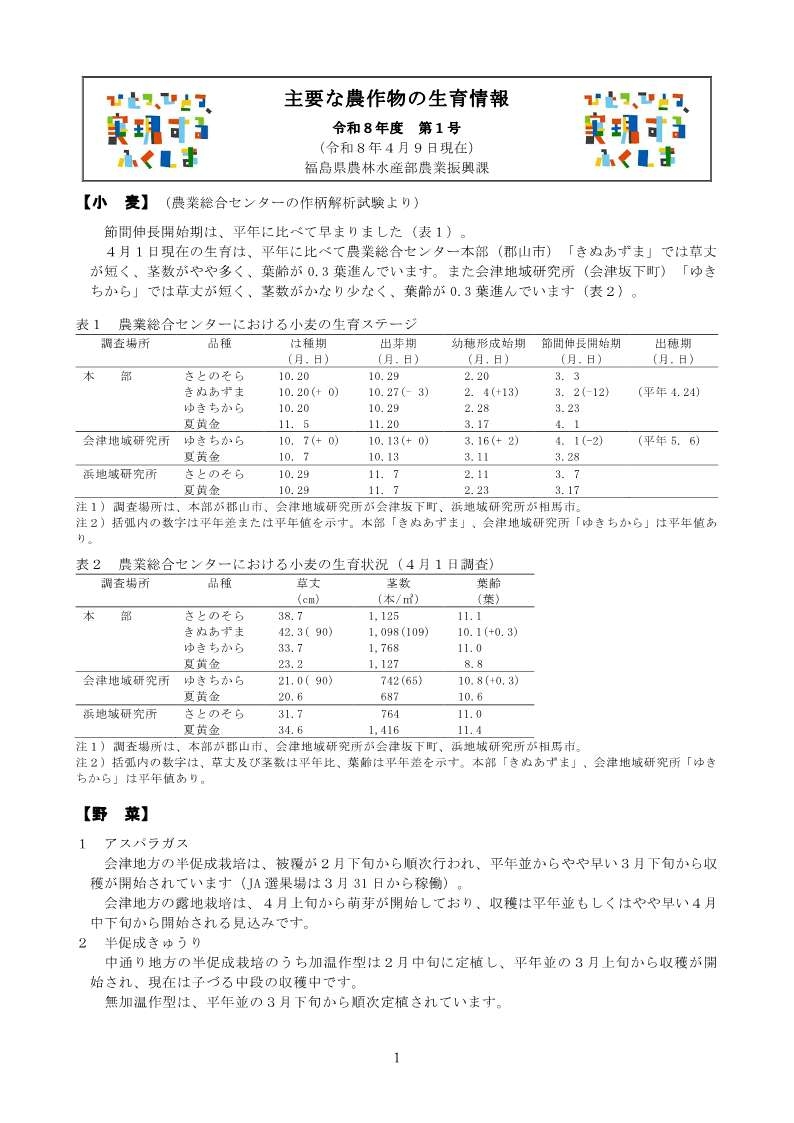 農業情報LINE令和8年度主要な農作物の生育情報 第1号について(令和8年4月9日現在)