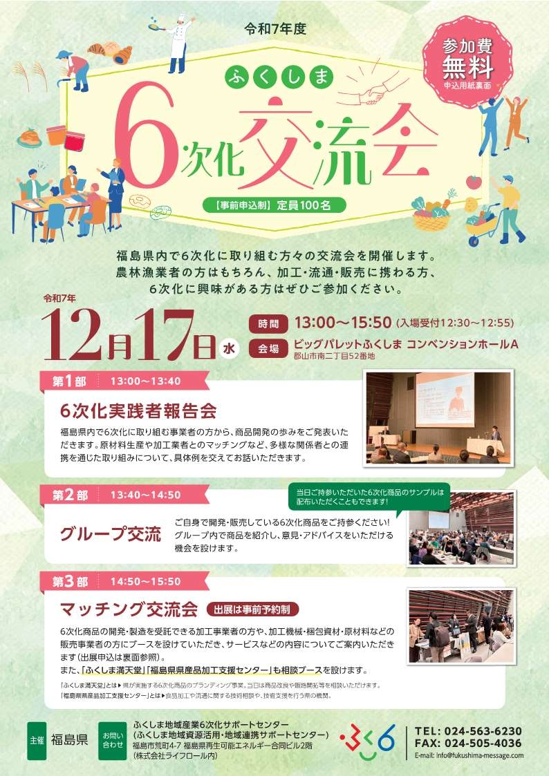 ふくしま地域産業6次化サポートセンターでは、本年12月17日(水)に郡山市で開催する6次化交流会の参加者を募集しています!参加申し込みの〆切は12月1日(月)までです。 参加費は無料ですので、皆様、奮ってお申込みください。 ◎「令和7年度ふくしま6次化交流会」 日 時:12月17日(水)13:00~15:50 場 所:ビッグパレットふくしま コンベンションホールA (郡山市南二丁目52番地) 参 加 費:無料 内 容:第1部 6次化実践者報告会 第2部 グループ交流 第3部 マッチング交流会 申込方法:チラシ裏面のQRコードからまたは裏面の参加申込書に記入の上、FAXにてお申込みください。 申込期限:令和7年12月1日(月) お問い合わせ:ふくしま地域産業6次化サポートセンター ☎024-563-6230 皆様の御参加、お待ちしています!