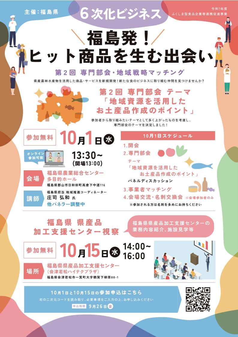 10月1日(水)、福島県が主催する6次化ビジネスふくしまフードプロジェクト第2回専門部会&地域戦略マッチングが開催されます! 6次化に興味のある方、お話だけでも聞いてみませんか?オンラインでも参加可能ですので、お気軽にお申込みください! 〆切が迫っておりますので、ご応募はお早めに! 1開催日時 令和7年10月1日(水)午後1時30分~ ※オンライン参加も可 2開催場所 福島県農業総合センター多目的ホール (郡山市日和田町高倉下中道116) 3テーマ 「地域資源を活用したお土産品作成のポイント」 地域推進コーディネーター 庄司弘和氏 4応募方法 添付チラシのQRコードからまたは下記URLから https://fukushima-ffp.com/ 5応募〆切 令和7年9月26日(金)まで 6お問い合わせ FFP事務局 電話024-905-1295