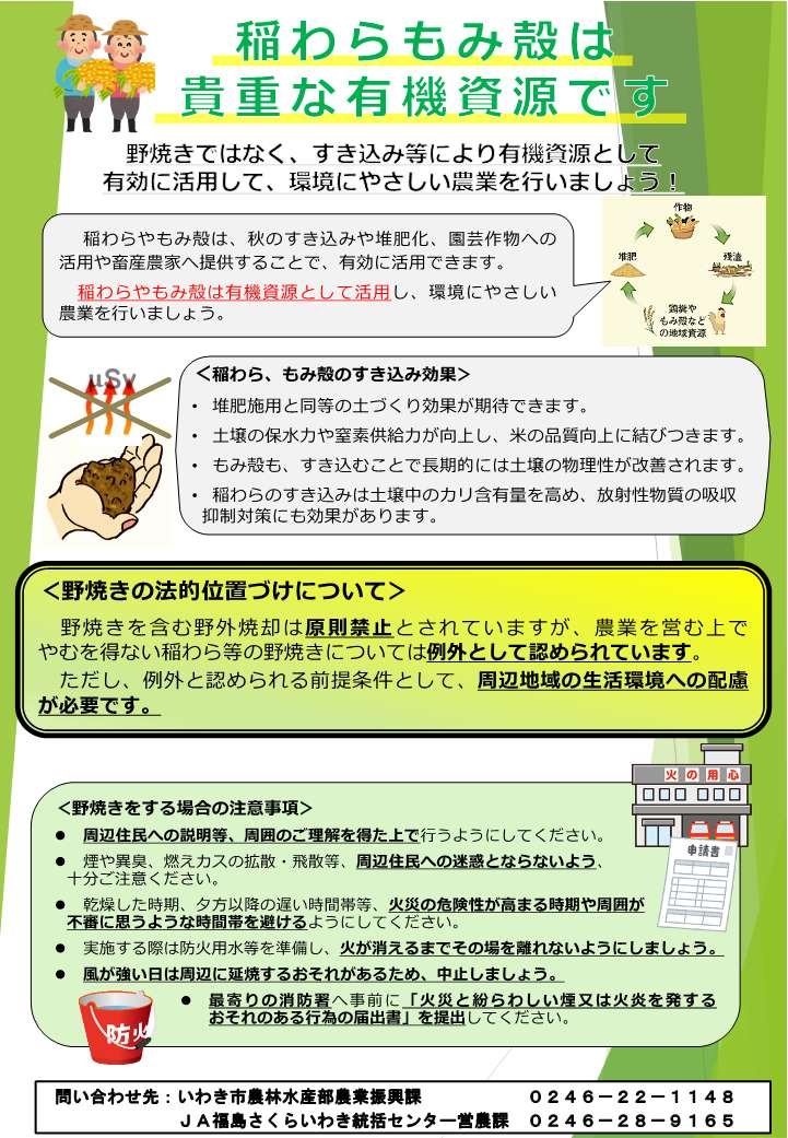 稲わらやもみ殻は、秋のすき込みや堆肥化、園芸作物への活用や畜産農家へ提供することで、有効に活用できます。 稲わらやもみ殻は有機資源として活用し、環境にやさしい農業を行いましょう! やむを得ず野焼きをする場合は次の注意事項を遵守して下さい。 ①周辺住民への説明等、周囲のご理解を得た上で行うようにしてください。 ②煙や異臭、燃えカスの拡散・飛散等、周辺住民への迷惑とならないようにしてください。 ③乾燥した時期、夕方以降の遅い時間帯等、火災の危険性が高まる時期や周囲が不審に思うような時間帯を避けてください。 ④実施する際は防火用水を準備し、火が消えるまでその場を離れないようにしましょう。 ⑤風が強い日は周辺に延焼するおそれがあるため、中止しましょう。 ⑥最寄りの消防署へ事前に「火災と紛らわしい煙又は火炎を発するおそれのある行為の届出書」を提出してください。 ※届出書様式は次の市HPアドレスよりダウンロードできます。 https://www.city.iwaki.lg.jp/www/contents/1725936027505/index.html