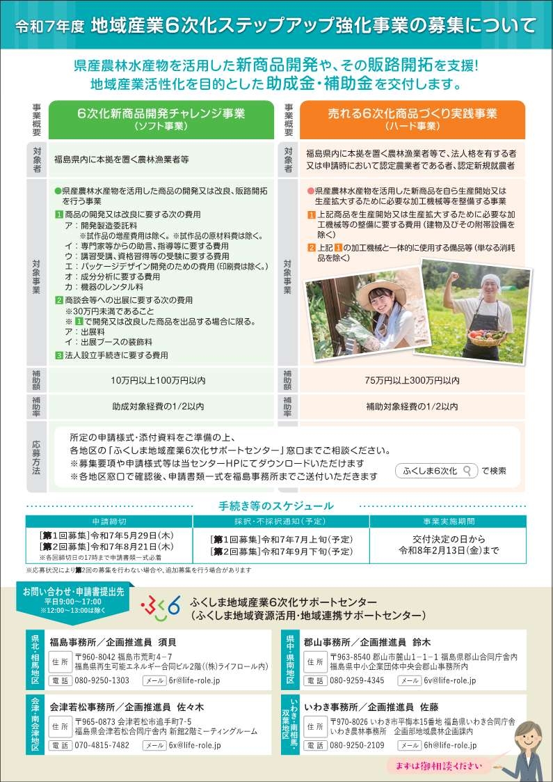 福島県が実施している県産農林水産物を活用した新商品開発やその販路開拓を支援する助成金・補助金の募集が始まりました! 第1回募集締切は令和7年5月29日(木)です。 詳しくは添付資料をご覧ください。 【問い合わせ先】 ふくしま地域産業6次化サポートセンター いわき・南相馬・双葉担当 企画推進員 佐藤 電話080-9250-2109