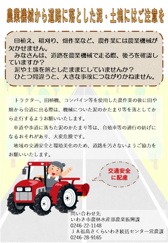 農繁期は作業のため農作業用車両で道路を通行する機会が多くなります。 トラクター、田植機、コンバインなどを使用した後に、田畑から公道に出る際は機械についた泥のかたまりを落としてから走行するようお願いします。 車道や歩道に落ちた泥のかたまりなどは、自動車などの通行の妨げになる恐れがあり大変危険です。 地域の交通安全と環境美化のため、道路を汚さないようご協力をお願いいたします。