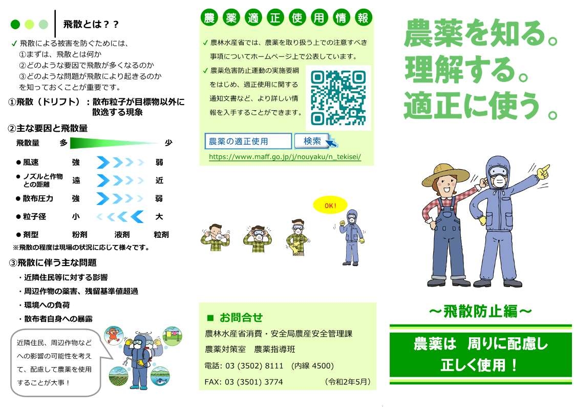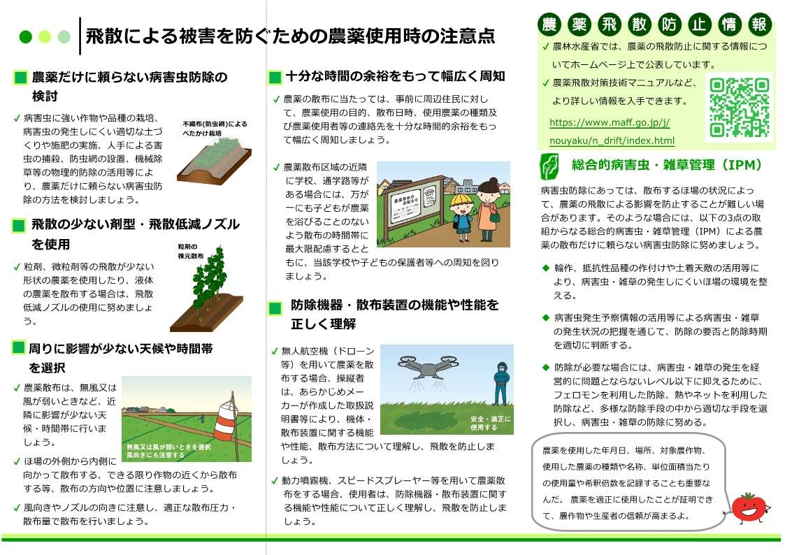 農家のみなさまにおかれましては、引き続き農薬(除草剤、殺虫剤、殺菌剤等)の散布を行う場合には、改めて下記内容に注意していただくようお願いいたします。