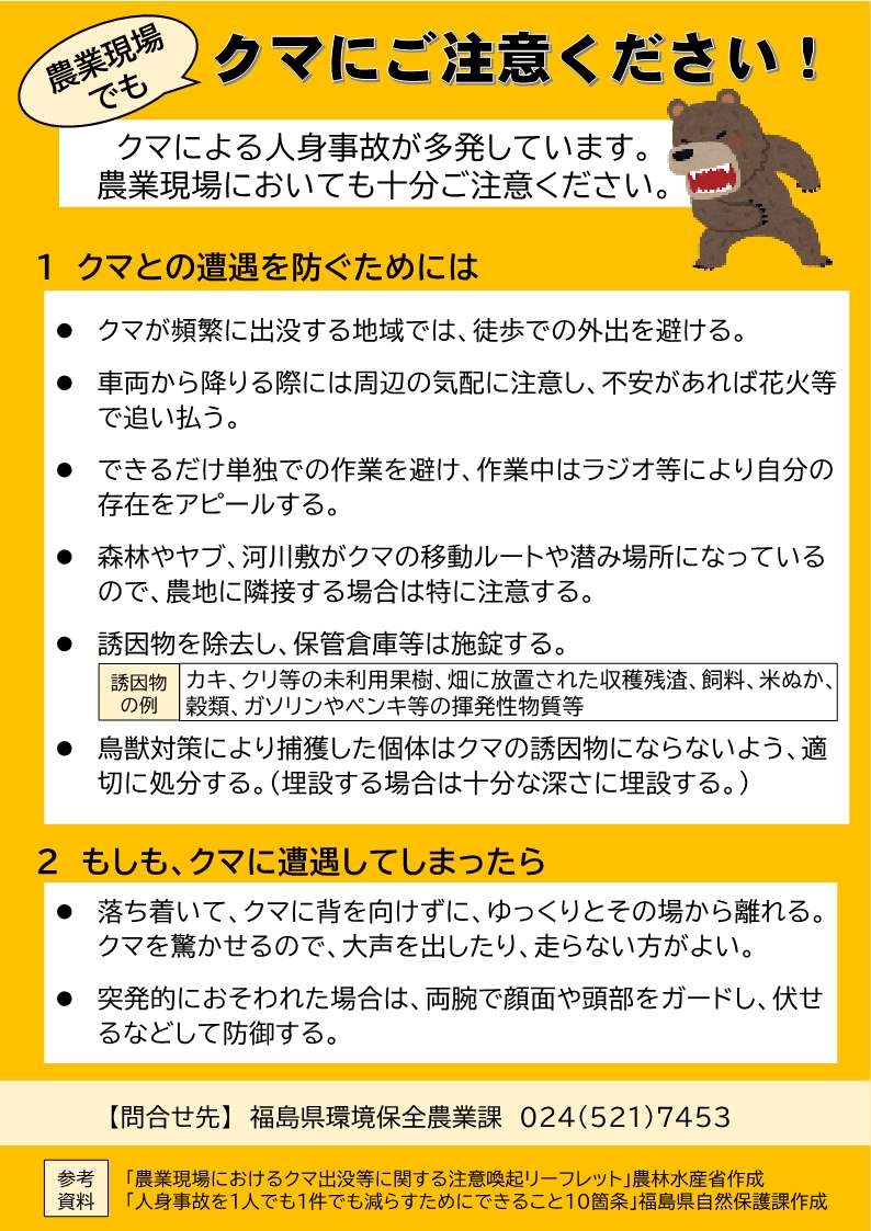 また、本市においてもクマの目撃情報が多数寄せられており、農業現場でも注意が必要です。