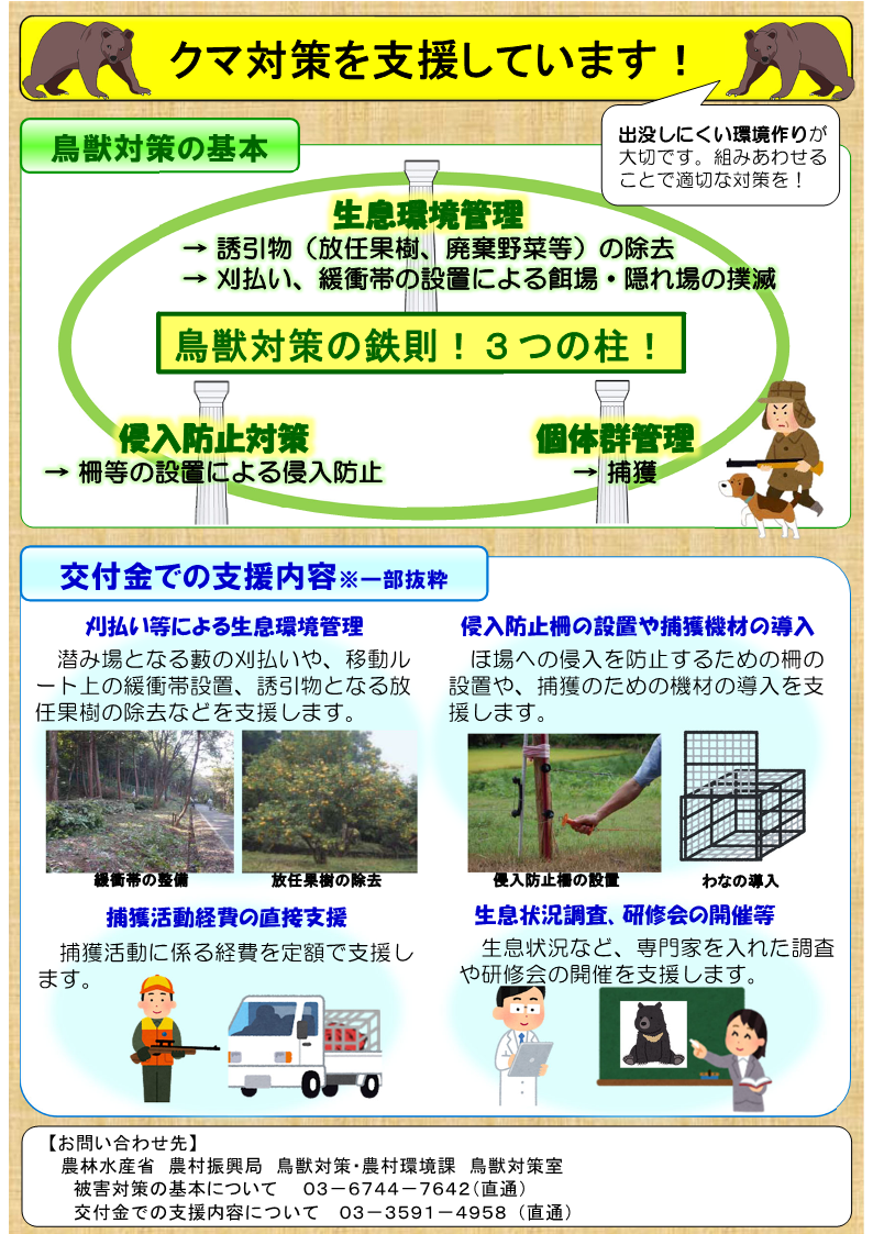 クマの出没防止策や万が一遭遇してしまった場合の対処について、国がチラシを作成しましたので、ご確認くださるようお願いします。