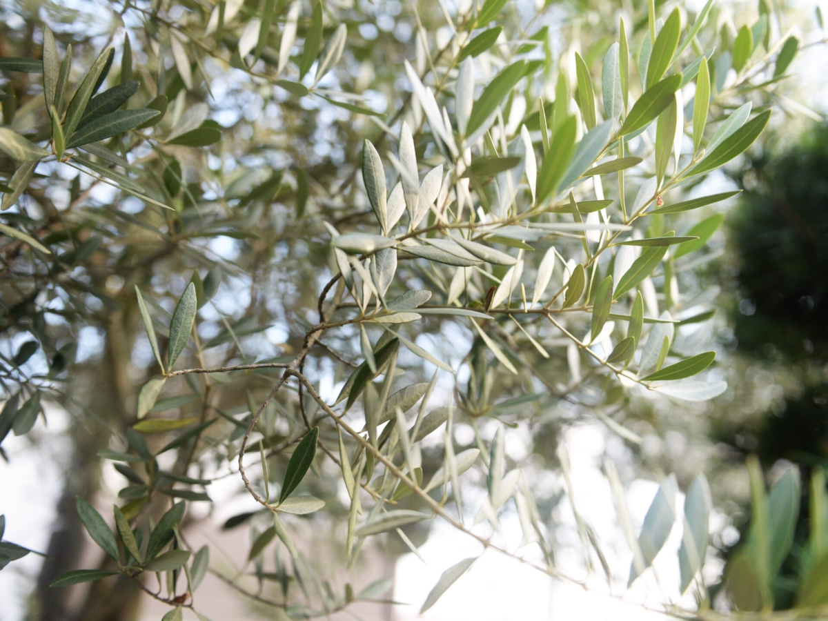 こちらは銀色に輝くオリーブの葉。渡邊さんはオリーブも栽培しており、収穫した実から搾油機を使って自家製のオリーブオイルも生産しています。しぼりたてのオイルはさわやかな風味が引き立つフレッシュな味わい。普段のサラダが何倍もおいしく感じられます。安全性にこだわっているため、保湿剤代わりに肌や髪につける人も多いそうです。