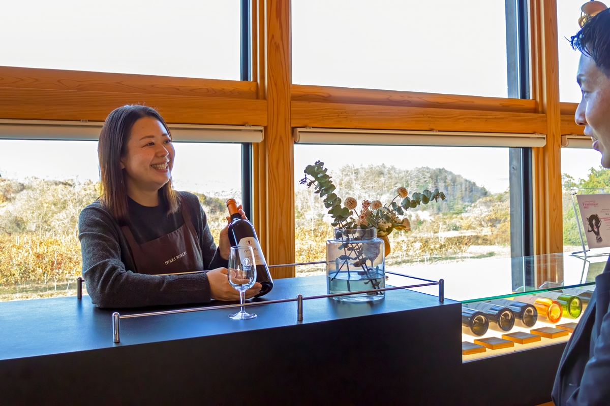 「いわきワイナリーガーデンテラス&ショップ」では、常時約25種類のワインを販売。有料でテイスティングも楽しめるほか、ワインセラー見学やぶどう栽培体験もできます。(要予約)