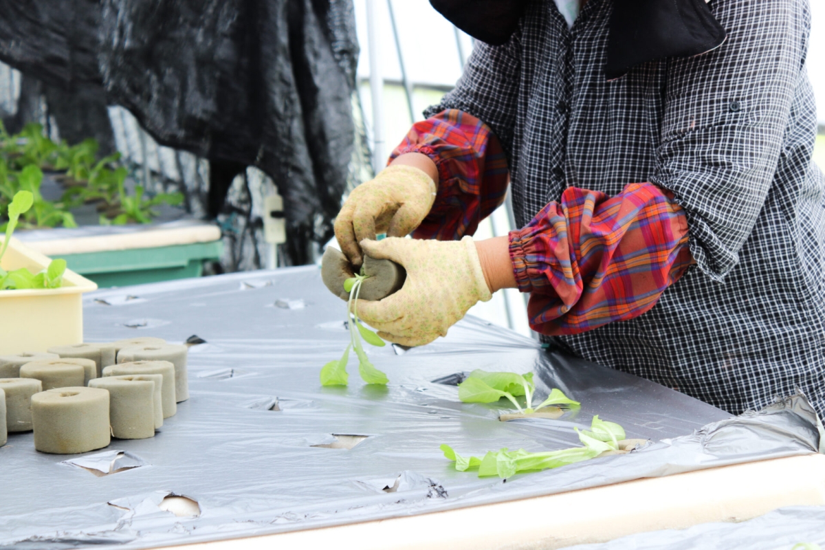 安全な野菜を育てるために、手間は惜しみません。ハウスとは別室の温度を一定にした部屋で、リーフレタスの種を一つひとつスポンジに植えています。細かく根気のいる作業です。