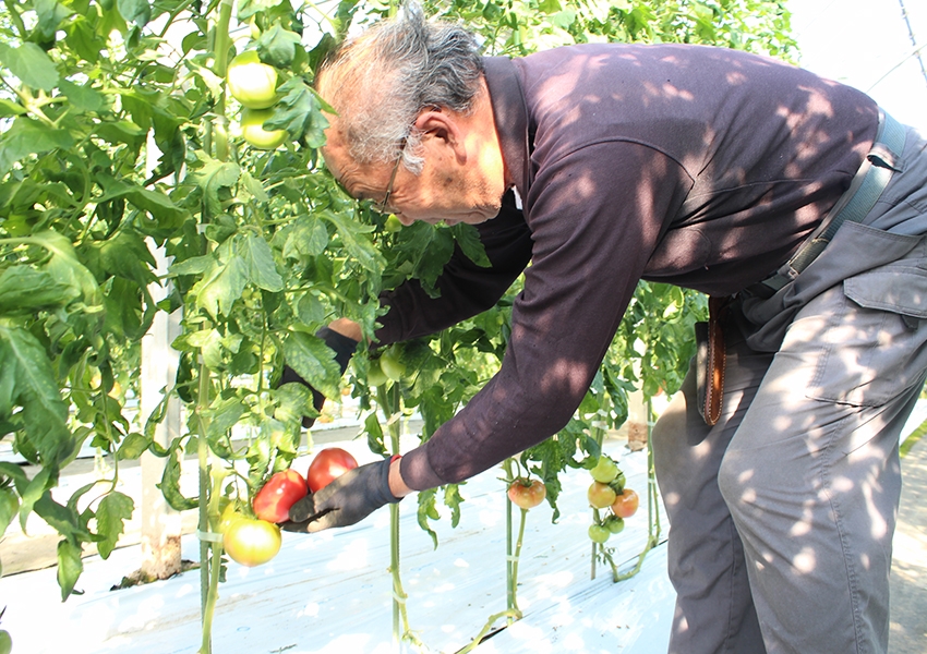 もみ殻を発酵させた堆肥を使用し、炭を使った土壌改良、木酢液を活用した病虫害の防除など、環境と健康に優しい栽培方法を取り入れながら、50年以上に渡りトマトに情熱を注いでいます。