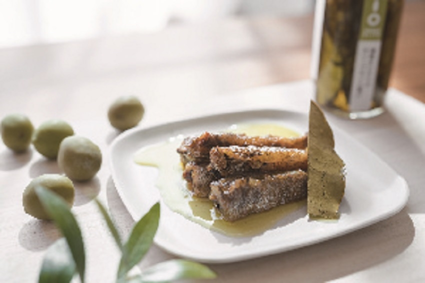 いわきオリーブ株式会社では収穫したオリーブを使ったさまざまな自社商品も開発しています。オリーブオイルやオリーブ茶、オリーブパスタのほか、写真の発酵めひかりのオリーブオイル漬けも人気です。