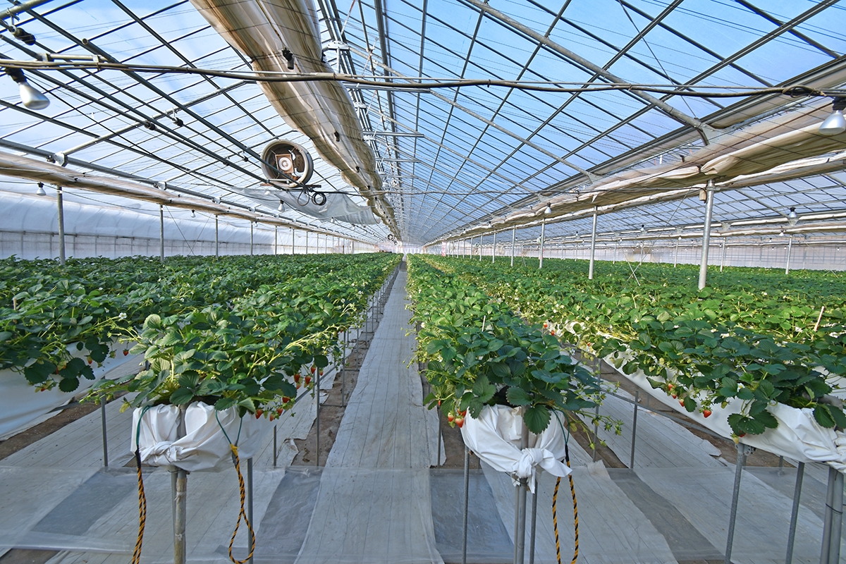 全長約80mの広大なハウスで、約16,000本の「章姫」と、約700本の「紅ほっぺ」を栽培。水はけがよく、保水性・通気性に優れた杉の皮を使用した培地で高設栽培を行っています。