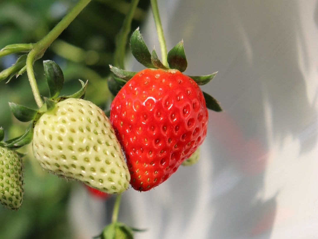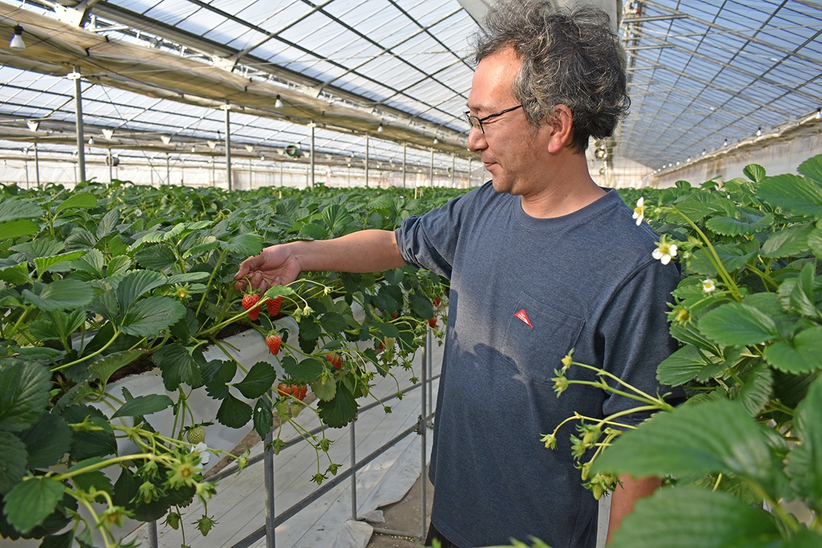 そんな秀史さんが、新たに栽培を開始したのが、こちらの「紅ほっぺ」。「紅ほっぺ」は、章姫とさちのかを掛け合わせた品種で、甘みと酸味のバランスが良く、香りも良好で、果肉がしっかりしているのが特徴。熟すと果皮から果肉まで赤くなり、ほっぺが落ちるような食味の良さが名前の由来だそう。
