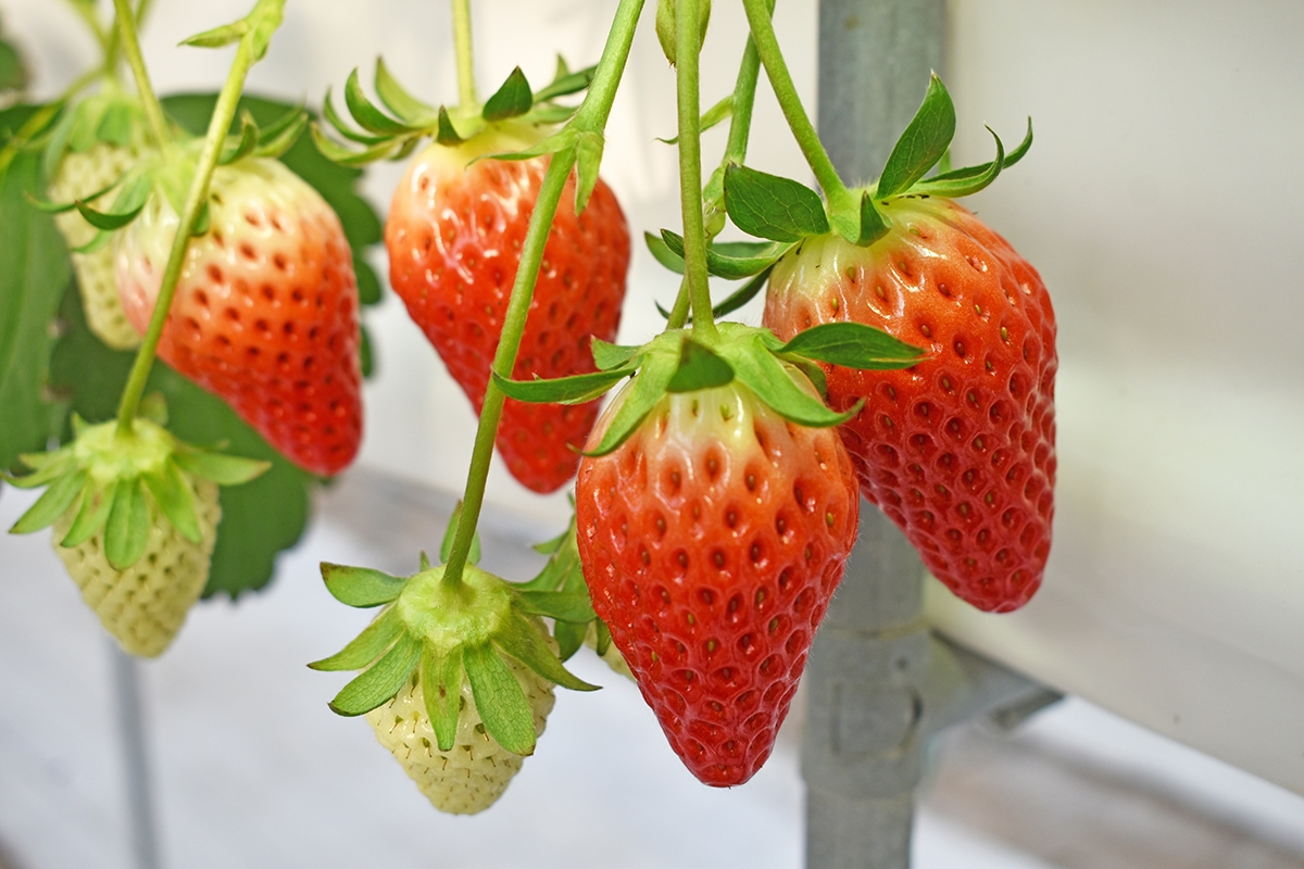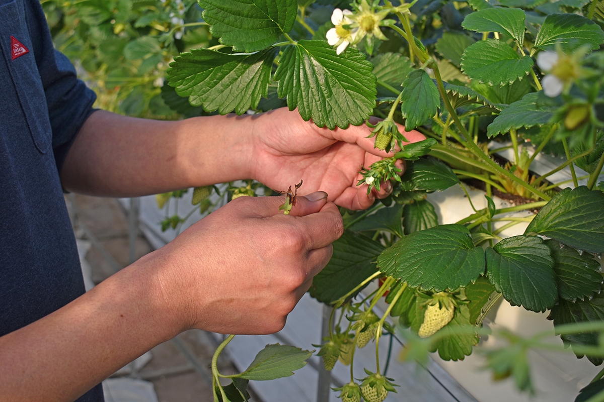 不要な葉やツルを摘む作業は、果実に太陽の光と栄養を集中させ、大きく甘いいちごを育てるためにとても重要。毎日欠かさず、丁寧に行っています。曇りの日が続く時は、光合成の不足によりいちごの味が落ちるのを防ぐため、栄養素を補い、シーズンを通じて常に美味しいいちごを提供できるよう努力を重ねています。