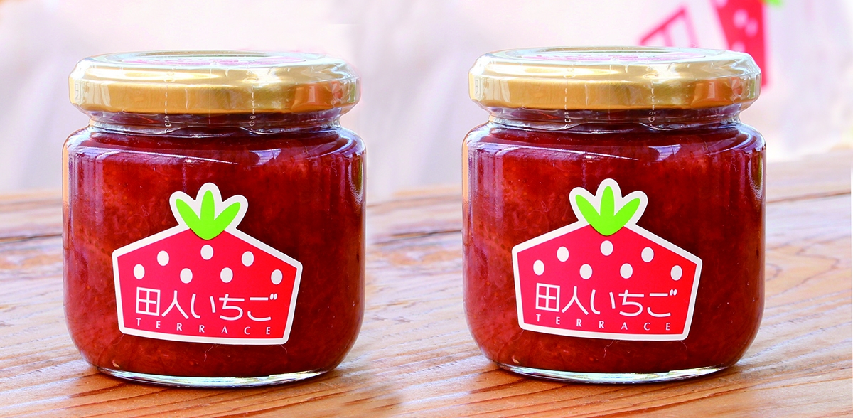 いちごとブルーベリーを使った「ダブルベリージャム」です。使用するブルーベリーも田人観光いちご園で栽培したもの。いちごジャムとの見分け方は、瓶側面のいちご型のシール!いちごジャムは「田人いちご」、ダブルベリージャムは「tabito」と書かれています。なお、毎年11月に開催されている「たびとほっこり祭」限定で「ブルーベリージャム」も販売しています。