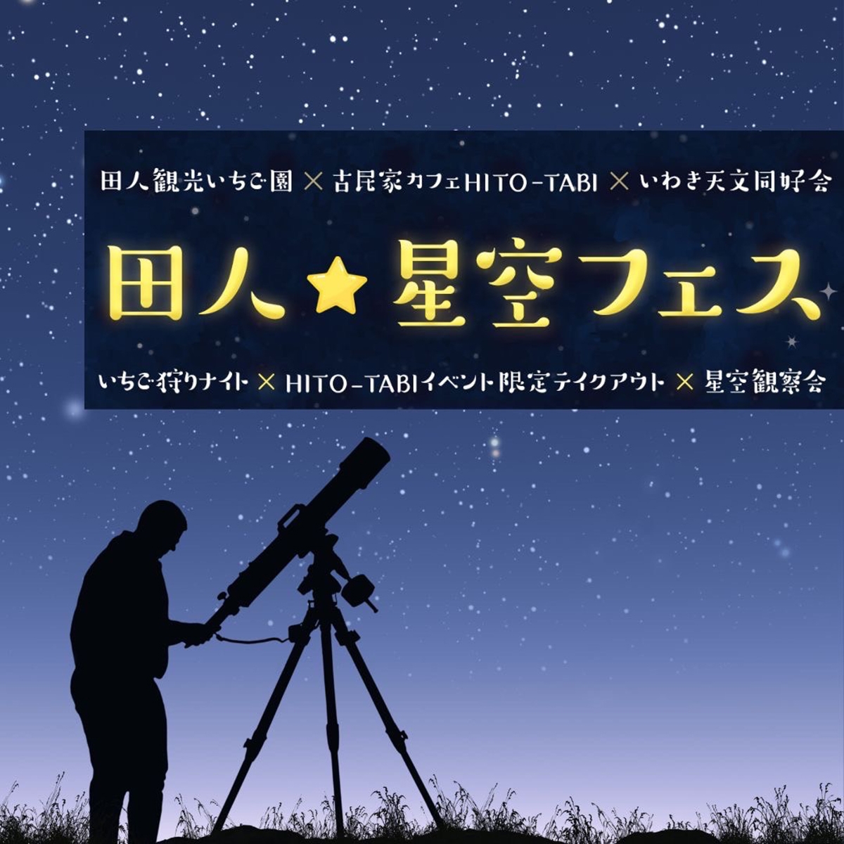 2025年4月、秀史さんは「田人☆星空フェス」と題し、田人観光いちご園の「いちご狩りナイト」、古民家カフェ&ゲストハウスHITO-TABIのお弁当「オリジナル油淋鶏ボックス」、いわき天文同好会の「星空解説&星空鑑賞」を楽しむイベントを開催しました。いつもと違う夜のいちご狩りを多くのお客様が楽しんだそうです。