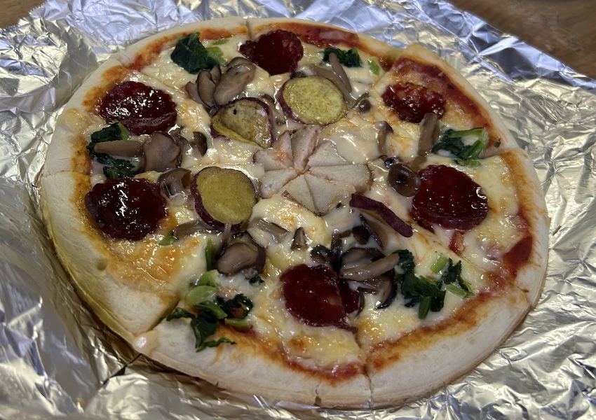 薪ストーブで焼き上げる野菜たっぷりの『やまぼうしピザ』。