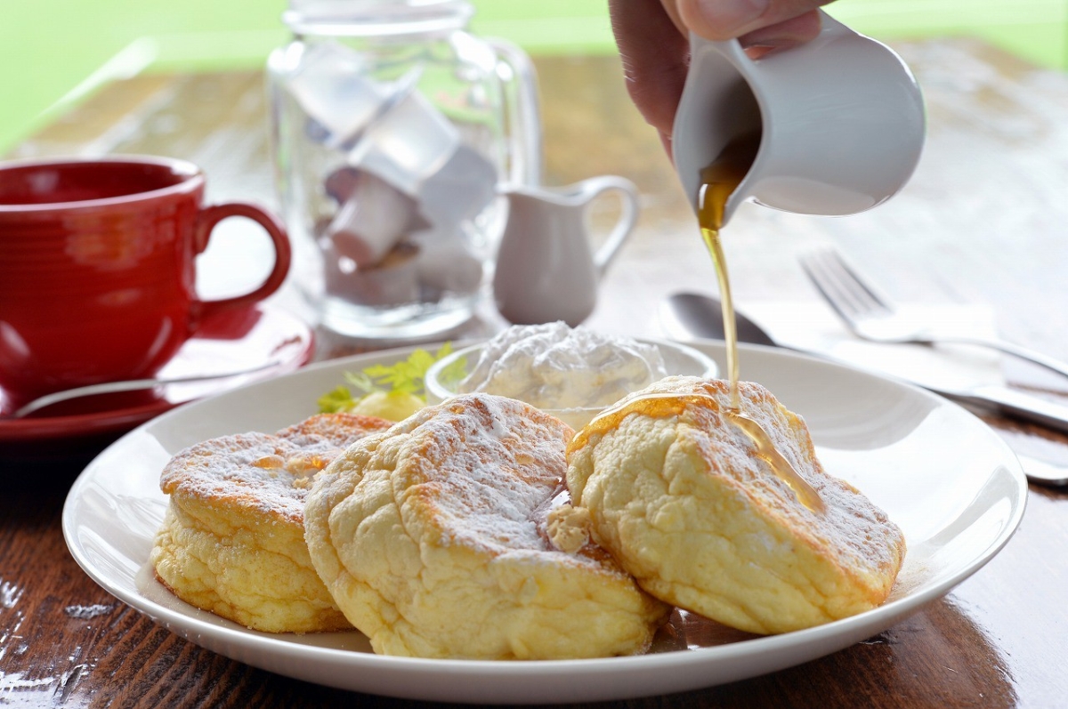 ふわふわ食感でリピーター続出のパンケーキは、常磐藤原町の「奈良屋」の豆腐を使用し、糖質やカロリーを控えめに、美味しく食べられます。