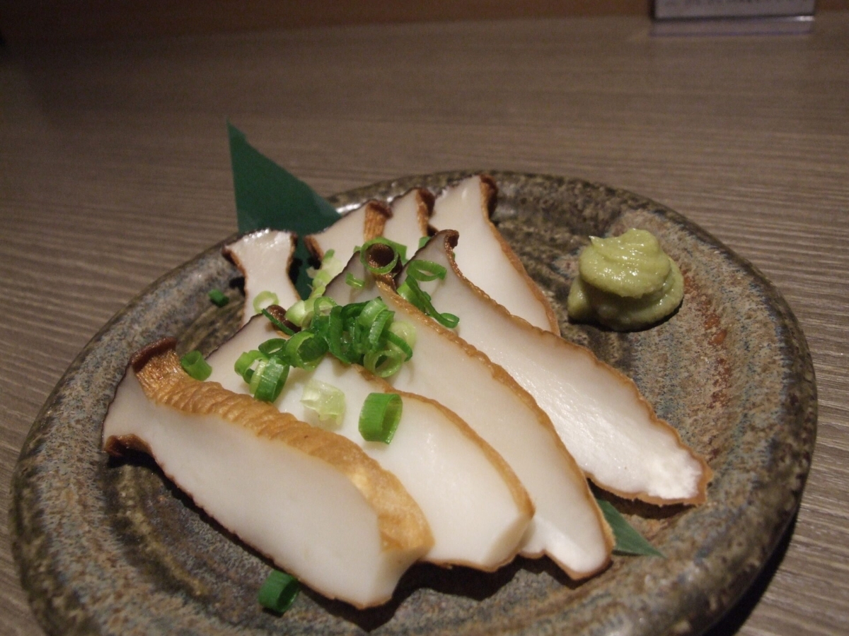 表面を軽く素揚げしたエリンギを醤油とわさびでいただくシンプルな料理。