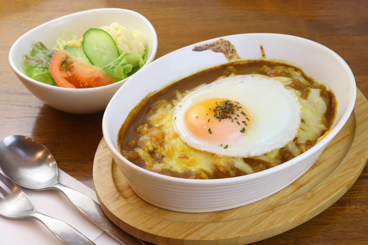こちらは人気の「焼きカレー」。インドカレーと欧風カレー2種類のルーをライスにかけ、チーズを載せて焼き上げたカレードリアです。