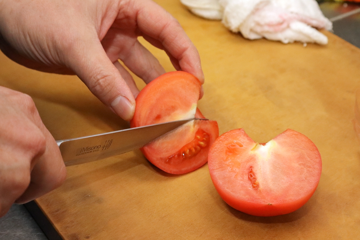 トマトは「あかい菜園」の大玉の桃太郎を使用しています。冬場の自家栽培が難しいため、奥さんの親戚から薦められて仕入れるようになったそうです。「あかい菜園さんのトマトは、どの時期でも採れたてのものが仕入れられるので、鮮度の良いトマトを使用するのにとても重宝しています。味が濃厚で、カレーの旨味を引き立ててくれます」と塩さん。