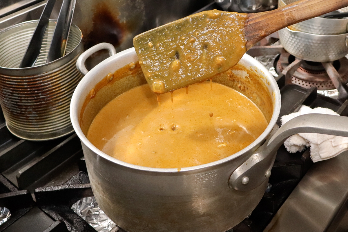 ポークカレーを煮込む塩さん。焦がさないようしっかりかき混ぜながら、丁寧に作っています。また、インドカレーは15種類のスパイスを使用。水を一切使用せず、鶏肉や野菜から出る水分やヨーグルトで煮込んでいるため、旨味が凝縮されています。なお、カレーの辛さはお好みに合わせて変更可能です。
