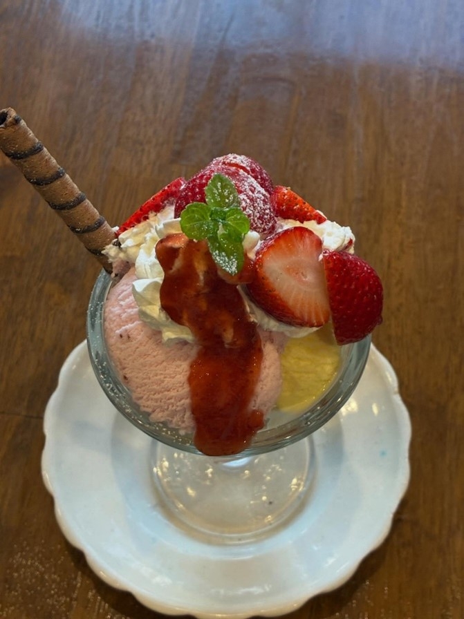 いちごの季節に登場する「いちごパフェ」。できるだけ「アグリパークいわき」のいちごを使用しているそう。なお、カリー工房は、スイーツも充実しています。