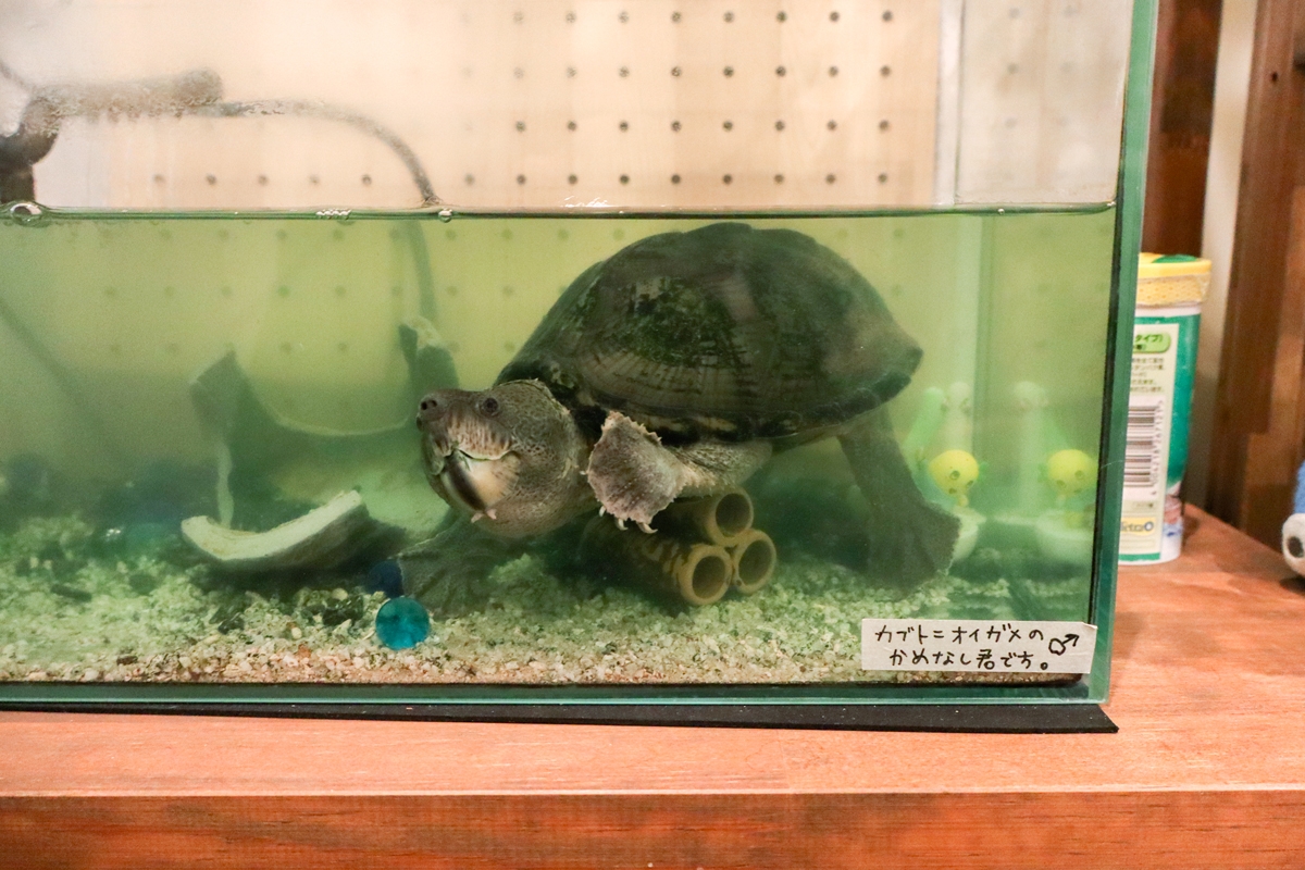 店舗エントラスでは、カリー工房の看板亀である、カブトニオイガメの「かめなし君」がお出迎え。クールでイケメンな男の子です。