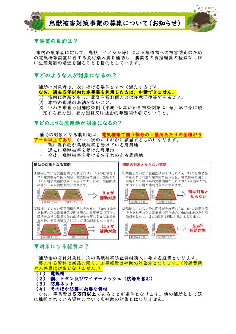 イノシシ等の鳥獣による農作物被害防止のための電気柵等の資材購入費の一部を次のとおり補助します。 〇補助対象経費 鳥獣による農作物被害の防護に必要な電気柵や網、トタン、くいなどを含むワイヤーメッシュ、防鳥ネットなどの資材購入費(資材は新品に限る)。 〇補助対象農用地 補助対象の農用地は、電気柵等で囲う部分の1箇所あたりの面積が5アール以上、かつ、現に農作物が鳥獣被害を受けているまたは 過去に鳥獣被害を受けたことがあるまたは今後、鳥獣被害を受けるおそれがある農用地です。 〇補助率・上限額 補助対象経費(5万円以上に限る)の2分の1以内(補助金の限度額は上限10万円) 〇申込方法 市農業振興課、各支所に備え付けの提出書類を作成し、市農業振興課へ提出してください。 ※ 予算額に達した時点で受付を終了します。 ※ 事業の詳細は市公式ホームページをご確認ください。 https://www.city.iwaki.lg.jp/www/contents/1774484322626/index.html お問い合わせ先 市農業振興課 ☎0246(22)7479