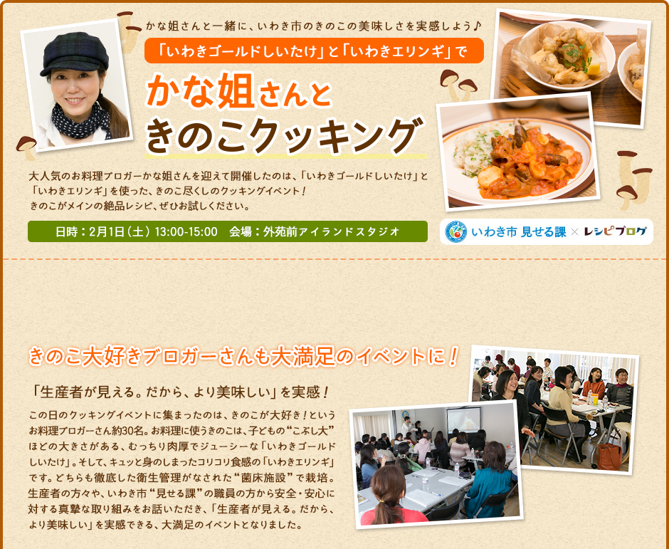 大人気のお料理ブロガーかな姐さんを迎えて開催したのは、「いわきゴールドしいたけ」と「いわきエリンギ」を使った、きのご尽くしのクッキングイベント!きのこがメインの絶品レシピ、ぜひお試しください。