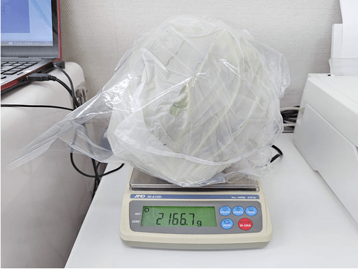 検体の重量を計測します。500g必要です。水洗いをして、食べない部分を取り除いた状態で検査します。