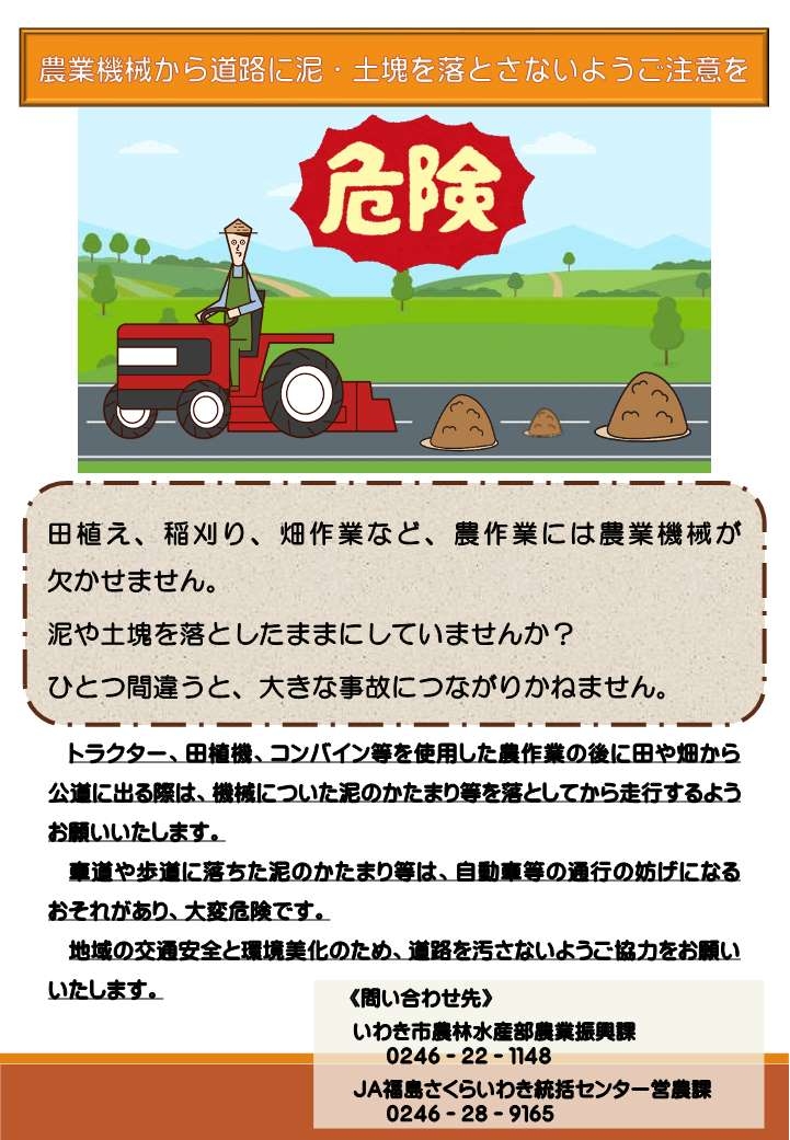 本年も10月半ばとなり、秋冬野菜等の出荷が本格化していく時期に入りました。 農家のみなさまにおかれましては、引き続き農薬(除草剤、殺虫剤、殺菌剤等)の散布を行う場合には、改めて下記内容に注意していただくようお願いいたします。 ※農薬(除草剤、殺虫剤、殺菌剤等)は極力使用しない管理を心掛け、やむを得ず使用する際は必要最小限度に留め、ラベルの表示事項の確認や飛散防止の徹底など農薬の適正な使用をお願いします。 【農薬使用時の特に注意すべき点】 ・農薬の散布は無風又は風が弱いときに行うとともに、農薬の飛散を抑制するノズルの使用に努め、近隣への影響を予防しましょう。 ・防除器具の洗浄を十分に行いましょう。 ・洗浄が不十分な場合、別の農作物に使用した農薬が混入したり、残留農薬基準値の超過につながる可能性があります。 ※残留農薬検査により基準値を超えた場合、農産物の販売が禁止され、自主回収等の対応を求められるためご注意ください。 詳細については、いわき市農業振興課のホームページをご覧ください。 URL:https://www.city.iwaki.lg.jp/www/contents/1718003793382/index.html