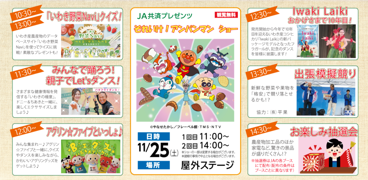 ステージアトラクション&出店者情報! <ステージアトラクション> 同時開催「IWAKI JAまつり2023」との共同ステージアトラクションで会場を盛り上げます!皆さんお楽しみに♪ 10:30 「いわき野菜Navi」クイズ! (1回目) 11:00 それいけ!アンパンマンショー (1回目) 11:30 みんなで踊ろう!親子でLet’sダンス! 12:00 アグリン☆ファイブといっしょ♪ 12:30 Iwaki Laiki おかげさまで10年目! (フラガール出演!) 13:00 「いわき野菜Navi」クイズ! (2回目) 13:30 出張模擬競り 14:00 それいけ!アンパンマンショー (2回目) 14:30 お楽しみ抽選会 <出店者・販売メニュー> 市内の人気店がお届けする、いわきの新鮮農産物を使った“Buzz”メニュー! 以下リンクから、お得な情報もチェック!! ① カフェ大百笑『キウイケーキ』 (https://www.instagram.com/p/Cz572xtv-TI/?igshid=MzRlODBiNWFlZA==) ② カエルかえるカフェ小川町店『恋するハッシュドポーク』 (https://www.instagram.com/p/Cz57-_pvcBO/?igshid=MzRlODBiNWFlZA==) ③ 和食酒場AFRO『ごろごろエリンギ石炭カレー』 (https://www.instagram.com/p/Cz58E95vEeo/?igshid=MzRlODBiNWFlZA==) ④ やきとり十八番『炭火焼鳥丼』 (https://www.instagram.com/p/Cz58NrnPM93/?igshid=MzRlODBiNWFlZA==) ⑤ delicacafe kibaco『和牛とフレッシュトマトのハンバーガー』 (https://www.instagram.com/p/Cz58TahvbC3/?igshid=MzRlODBiNWFlZA==) ⑥ CROSS WONDER DINING『骨付きチキンの炭火焼き~ワンダートマトのサルサ~』 (https://www.instagram.com/p/Cz58bk4PlCJ/?igshid=MzRlODBiNWFlZA==) ⑦ brasserie Rugged『いわき野菜と生ハムの食べるスープ(バケット付き)』 (https://www.instagram.com/p/Cz58gbVPX2o/?igshid=MzRlODBiNWFlZA==) ⑧ dining kitchen Ruu『親バカトマトといわきの野菜スープ』 (https://www.instagram.com/p/Cz58lmkP_Mv/?igshid=MzRlODBiNWFlZA==) ⑨ テラッツァ『たっぷり野菜とキノコのミートソーススパゲッティ』 (https://www.instagram.com/p/Cz58qDTvYDs/?igshid=MzRlODBiNWFlZA==) ⑩ ヘレナストロベリーランド『いちごミルク』 (https://www.instagram.com/p/Cz58t3ePuAV/?igshid=MzRlODBiNWFlZA==)