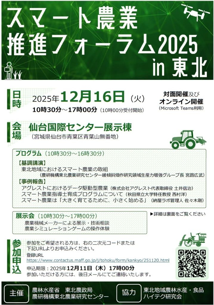 次のとおり開催されますので、お知らせいたします。 ■ 開催日時 令和7年12月16日(火) 10:30〜17:00(受付 10:00〜) ■ 開催形態 対面開催/オンライン開催 ■ 会場 仙台国際センター展示棟 (宮城県仙台市青葉区青葉山無番地) ■ 参加申込 チラシのQRコード、または下記URLからお申込みください。 https://www.contactus.maff.go.jp/j/tohoku/form/kankyo/251120.html ■ 申込期限 令和7年12月11日(木)17:00 ■ 問合せ先 東北農政局生産部環境・技術課 TEL:022-263-1111 (内線:4099、4189)