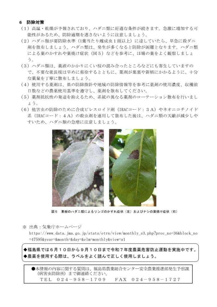 令和7年8月1日付けで福島県病害虫防除所から令和7年度病害虫防除情報(果樹ハダニ類)が発表されました。