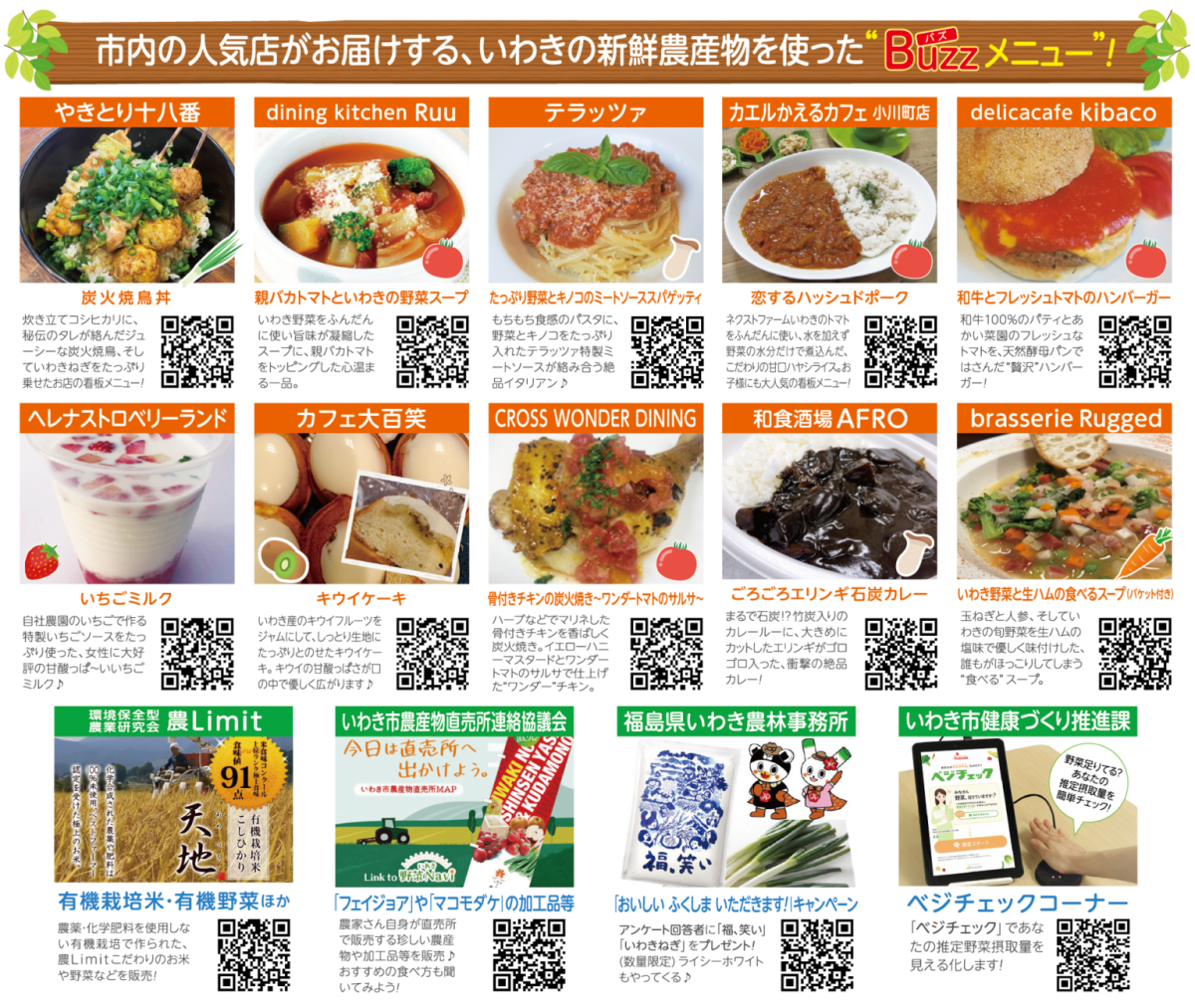 エリンギがゴロゴロ入った石炭カレーや特製いちごミルクなど、いわき市内の人気店がお届けする、いわきの新鮮農産物を使った”Buzzメニュー”が盛りだくさんです。