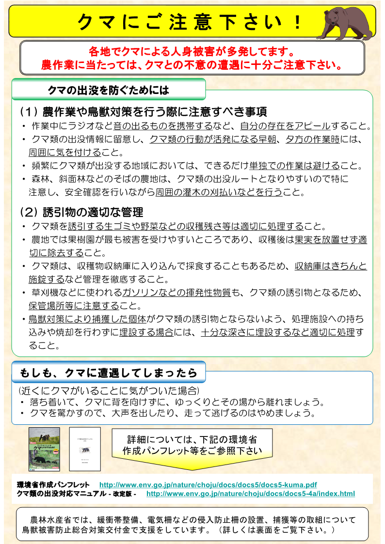 農業現場においては、収穫作業、果樹の剪定や肥培管理、ハウス栽培における各種作業等、屋外での管理作業や移動が伴うため、安全確保の徹底や農作物被害等の防止に向けてより一層の注意喚起が必要です。