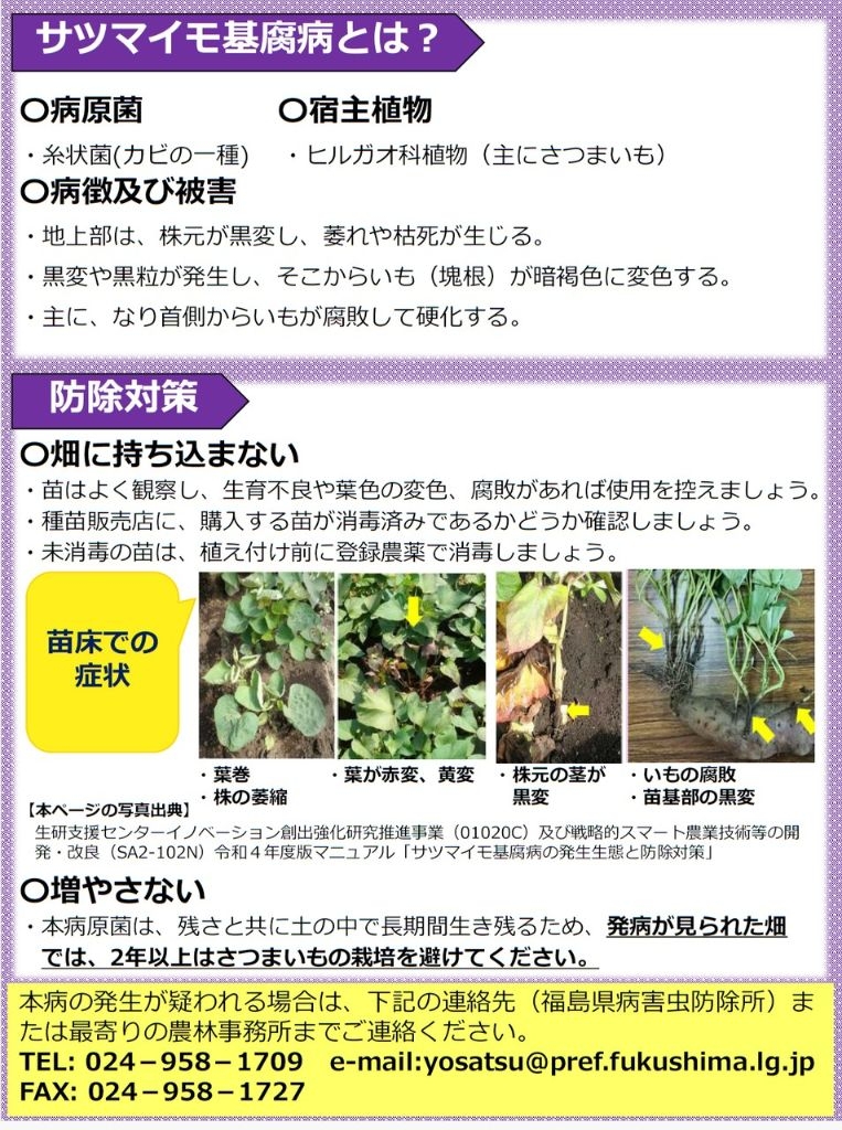 本病の発生が疑われる場合は、下記の連絡先(福島県病害虫防除所)