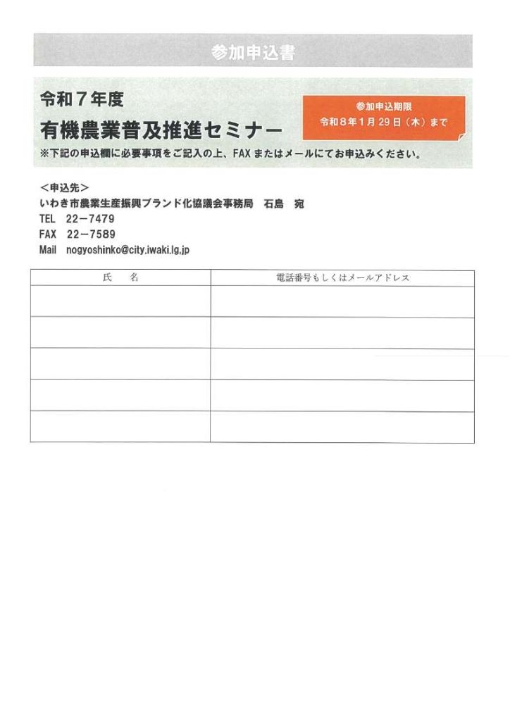 次の方法により、いわき市農業生産振興ブランド化協議会事務局(いわき市農業振興課)までお申し込みください。