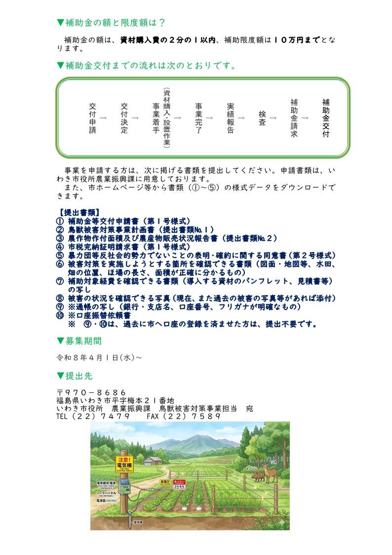 イノシシ等の鳥獣による農作物被害防止のための電気柵等の資材購入費の一部を次のとおり補助します。
