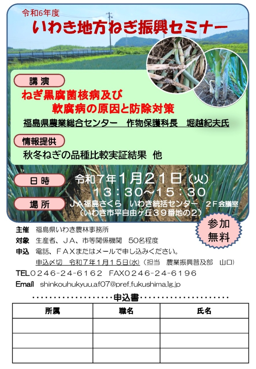 1 目的 いわき地方は、冬期の温暖な気象条件を活かして秋冬ねぎの指定産地になっており、揃いがよく品質も高いと、首都圏等出荷先の市場から高い評価を受けている一方、近年、黒腐菌核病や軟腐病等の難防除病害が多発し、生産現場では深刻な問題となっています。 そこで、それらの病害の原因とその対策を知り、今後の安定生産につなげるため本セミナーが開催されます。 2 日時 令和7年1月21日(火)13:30~15:30 3 場所 JA福島さくらいわき統括センター 2F会議室 4 内容 (1)講演会 「ねぎ黒腐菌核病及び軟腐病の原因と防除対策」 講師 福島県農業総合センター 作物保護科長 堀越紀夫 氏 (2)情報提供 秋冬ねぎの品種比較実証結果 他 5 参加費 無料 6 主催・申込先 福島県いわき農林事務所 電話、FAX、メールにてお申込みください。 申込〆切 令和7年1月15日(水) いわき農林事務所 農業振興普及部 経営支援課 電話 0246-24-6162 FAX0246-24-6196 メール shinkouhukyuu.af07@pref.fukushima.lg.jp