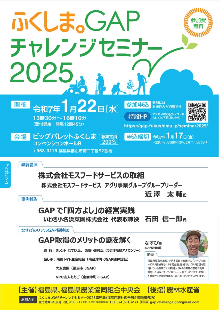 「GAP」とは、一般的には農業生産工程管理と呼ばれ、農業生産の各工程において、食品の安全確保や環境保全、労働安全の確保などに向けた取組を指します。今回、福島県並びに福島県農業協同組合中央会主催のGAPに関するセミナーが開催されます!GAPの取組を行うことによって、作業手順の標準化や効率化が図られ、さらに安全性が確保され、その結果としてよい農産物を作り出すことにつながります! より消費者に選ばれるワンランク上の農業生産を目指す方、この機会にぜひ参加してみませんか? 『ふくしま。GAPチャレンジセミナー2025』 開催日時:令和7年1月22日(水)13:30~16:10 開催場所:ビッグパレットふくしま コンベンションホールB(福島県郡山市南二丁目52) セミナー内容: 1.株式会社モスフードサービスの取組(株式会社モスフードサービス) 2.GAPで「四方よし」の経営実践(いわき小名浜菜園株式会社) 3.GAP取得のメリットの謎を解く(なすび) 参加費:無料 参加申込:特設HP https://gap-fukushima.jp/seminar2025/ またはFAX:024-533-4343 申込締切:令和7年1月17日(金) ※定員になり次第締め切りとなります。