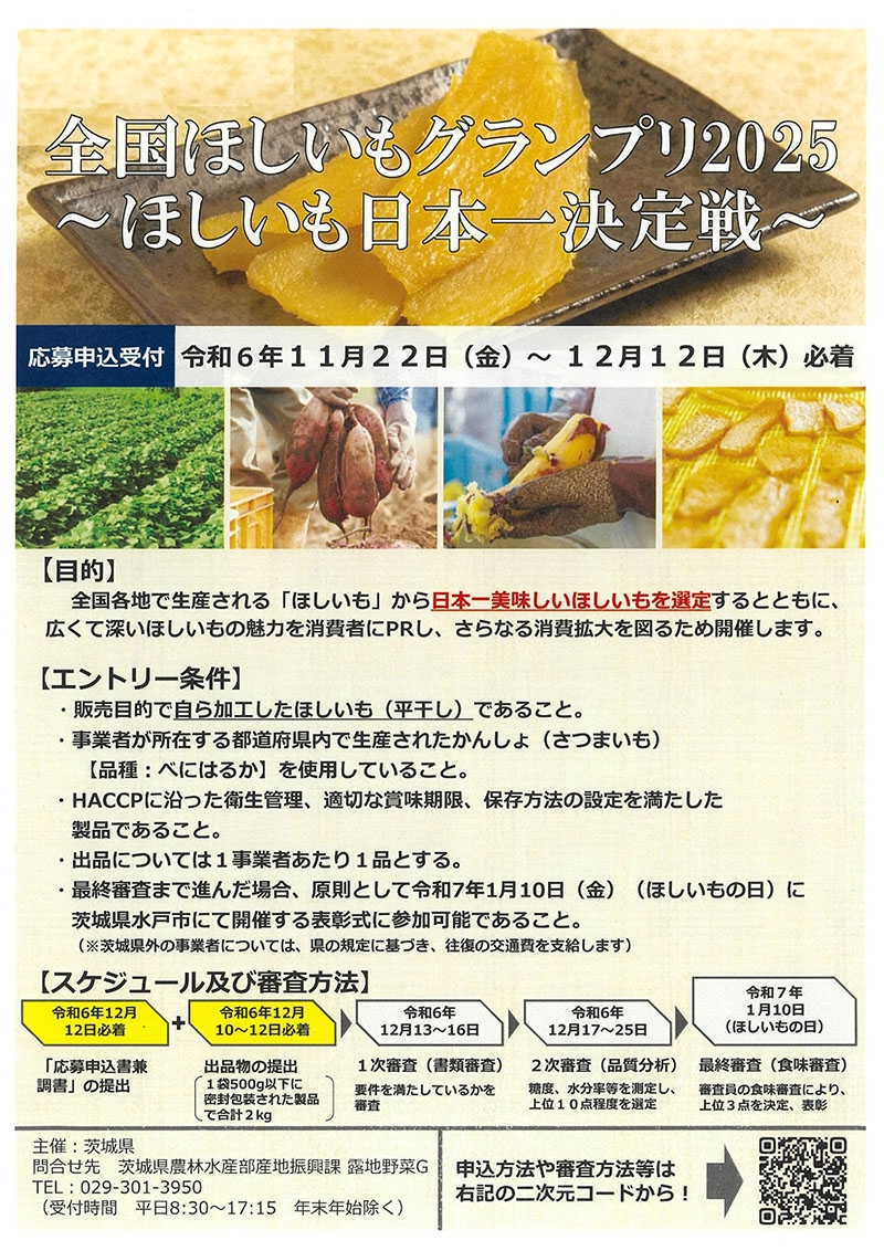 茨城県が日本一美味しいほしいもを決める『全国ほしいもグランプリ2025』を開催します! ご自身の味自慢のほしいもを出品してみませんか? 【目的】 全国各地で生産される「ほしいも」から日本一美味しいほしいもを選定するとともに、広くて深いほしいもの魅力を消費者にPRし、さらなる消費拡大を図るため。 【参加申込】 ★「応募申込書兼調書」と「出品物」の提出が必要です! 1.「応募申込書兼調書」※郵送またはメール 令和6年11月22日(金)~同年12月12日(木)まで(当日必着) 2.「出品物(1袋あたり500g以下に密封包装された製品、合計2キログラム)」※郵送または直接持参 令和6年12月10日(火)~同年12月12日(木)まで(当日必着) 【参加条件】 ・販売目的で自ら加工したほしいも(平干し)であること ・事業者が所在する都道府県で生産されたかんしょ(さつまいも)【品種:べにはるか】を使用していること ・HACCPに沿った衛生管理、適切な賞味期限、保存方法の設定を満たした製品であること ・出品は1事業者あたり1品まで ・最終審査まで進んだ場合、原則として令和7年1月10日(金)(ほしいもの日)に茨城県水戸市にて開催する表彰式に参加可能であること 詳しくは、添付のチラシまたはホームページをご覧ください。 https://www.pref.ibaraki.jp/nourinsuisan/sansin/yasai/hoshiimo/hoshiimogp2025.html 【提出・問い合わせ先】 〒301-8555 茨城県水戸市笠原町978-6 茨城県農林水産部産地振興課内 「全国ほしいもグランプリ2025」事務局 電話番号:029-301-3950(受付時間:平日8:30~17:15) MAIL:sansin3@pref.ibaraki.lg.jp