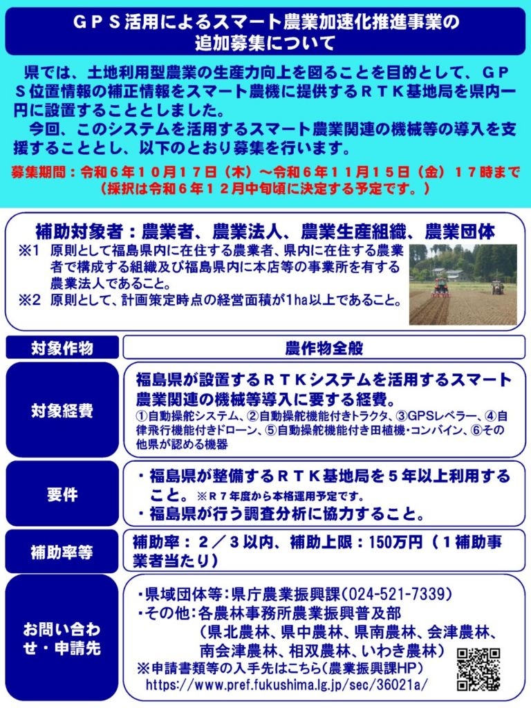 スマート農業(水稲・大豆・小麦)に興味をお持ちのみなさま、福島県からスマート農業に関する補助金追加募集のご案内です! 直進アシスト田植機等に搭載されている受信機に加えて、県が整備するRTK*基地局の受信機を事業実施年度から5年間ご使用いただくなどの要件を満たすことで、自動操舵機能付きトラクター・田植機・コンバイン、自動操舵システム等を導入される方に対し、購入費用を支援いたします! 募集期間が令和6年11月15日(金)までと短期ですので、ご相談・お申し込みはお早めに! *GPS以上の高精度を誇る測位システムとして、田植機等(自動操舵機能付き)に搭載されている受信機に加えて基地局の受信機を使用することで、取得できる位置情報の誤差を数cm内に抑えることが可能になる。 ※詳細は、添付のチラシを参照してください。 様式等のダウンロードは以下URLから可能です! https://www.pref.fukushima.lg.jp/sec/36021a/rtk-gps-hojo.html