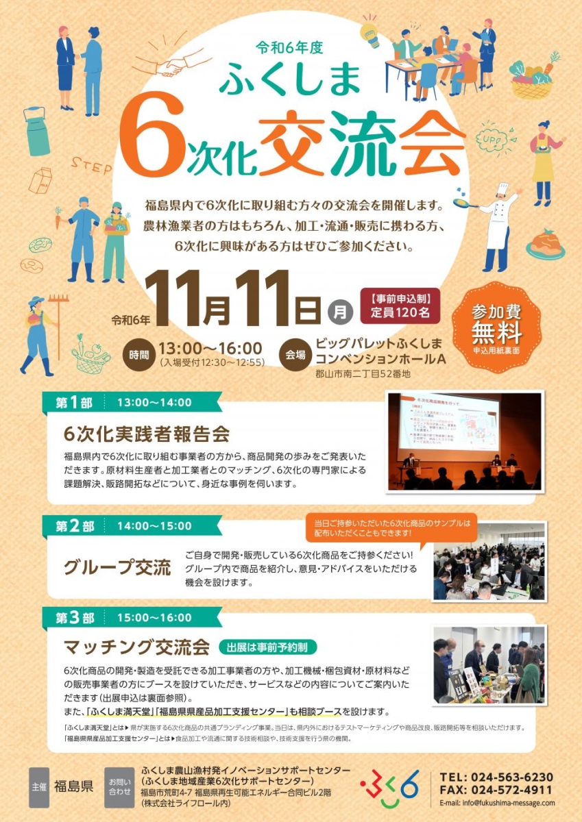 ふくしま6次化交流会のご案内です! 農林水産物の生産者、加工業者、加工機器メーカーなど、6次化に関わる多分野の方が多く参加します。身近な所での6次化の成功事例や失敗事例の紹介もあり、県内の人脈作りや仲間づくりにも繋がりますのでぜひご参加下さい。 日 時 令和6年11月11日(月)13:00~16:00 (入場受付12:30~12:55) 場 所 ビックパレットふくしま コンベンションホールA 内 容 ・6次化実践者報告会 ・グループ交流 ・マッチング交流会 その他 ・参加費無料 ・商品の試食などございましたらご持参下さい お申込 【要事前申込】https://forms.gle/QUXEGM73cLUz87r39 ※Googleフォームよりお申込み下さい(10/30〆切)
