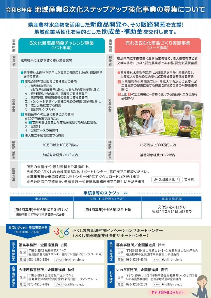 県産農林水産物を活用した新商品開発やその販路開拓を支援する、地域産業活性化を目的とした助成金・補助金の第4次募集が始まりました! 締切は令和6年10月31日(木)です。 詳しくは以下をご覧ください。 ソフト部門 https://www.fukushima-message.com/step1.html ハード部門 https://www.fukushima-message.com/step3.html