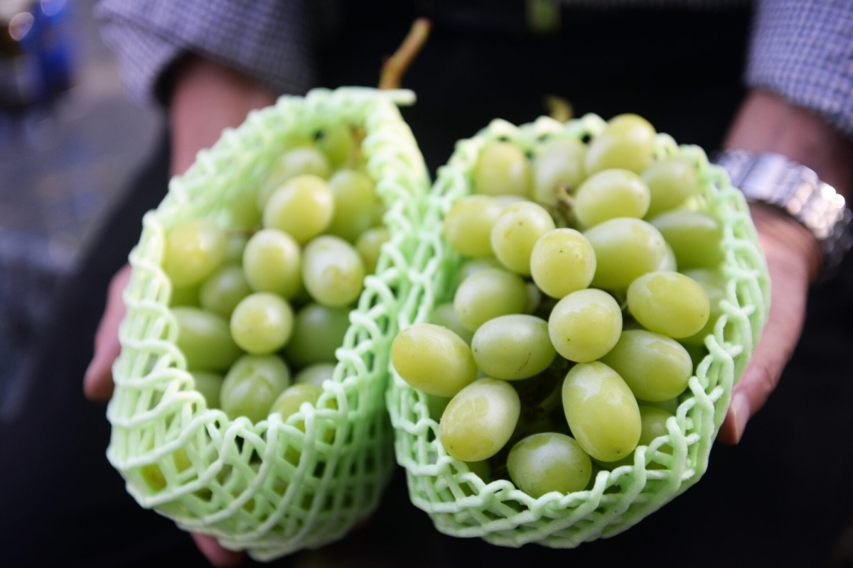 大粒でみずみずしい渡邊さんのシャインマスカット。2023年3月に苗木を植え、山梨の観光農園で栽培方法を学びました。2年目となる2024年夏に初めての収穫期を迎え、約400房を収穫しました。ほかにも、福島県で生まれたオリジナル品種の「あづましずく」、大粒の「グロースクローネ」、赤色の「クイーンニーナ」も育てており、今後は収穫時期や土地への適性をみながら栽培を拡充させる予定です。