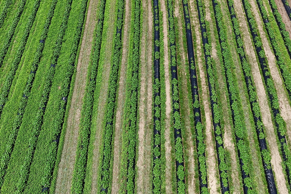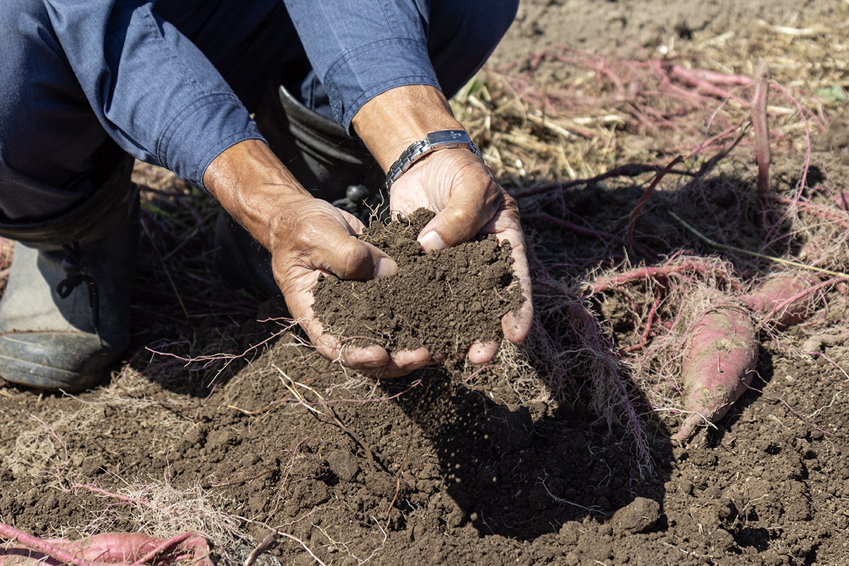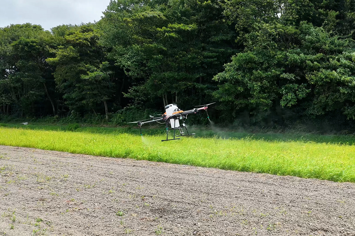 美味しいサツマイモの生産に欠かせない工程が、土づくり。サツマイモの割れや傷の要因となるセンチュウを抑制するために、ドローンで消毒剤を散布しています。