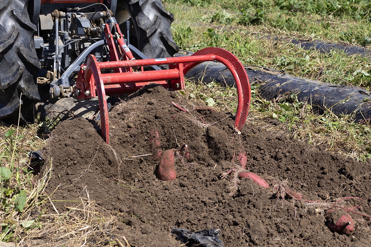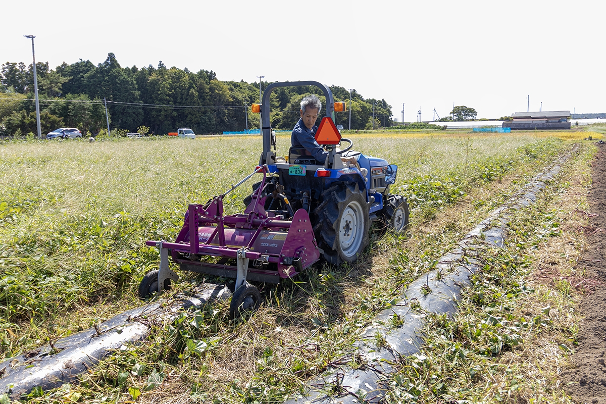 サツマイモの収穫は9月下旬~10月上旬。収穫作業は、まずビニールシートから生えている芋づるをトラクターで刈り取っていきます。刈り取られた芋づるは、そのまま肥やしとして利用します。
