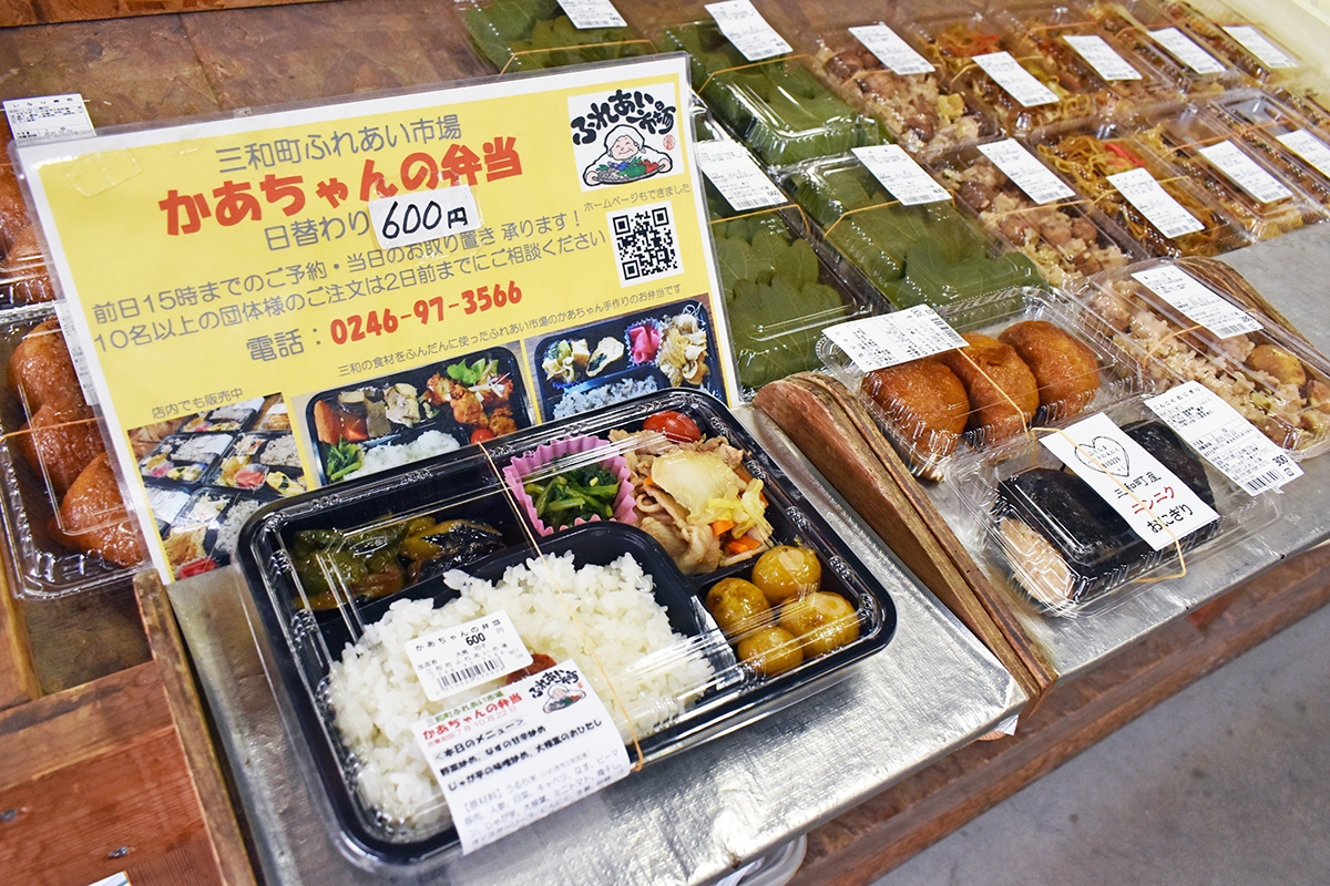 「三和町ふれあい市場」で人気の「かあちゃんの弁当」。三和町産の食材をふんだんに使用した、日替わりの料理が自慢のかあちゃんの手作り弁当です。毎月第一水曜日には、いわき市の本庁舎でも販売しており、職員にも大人気!