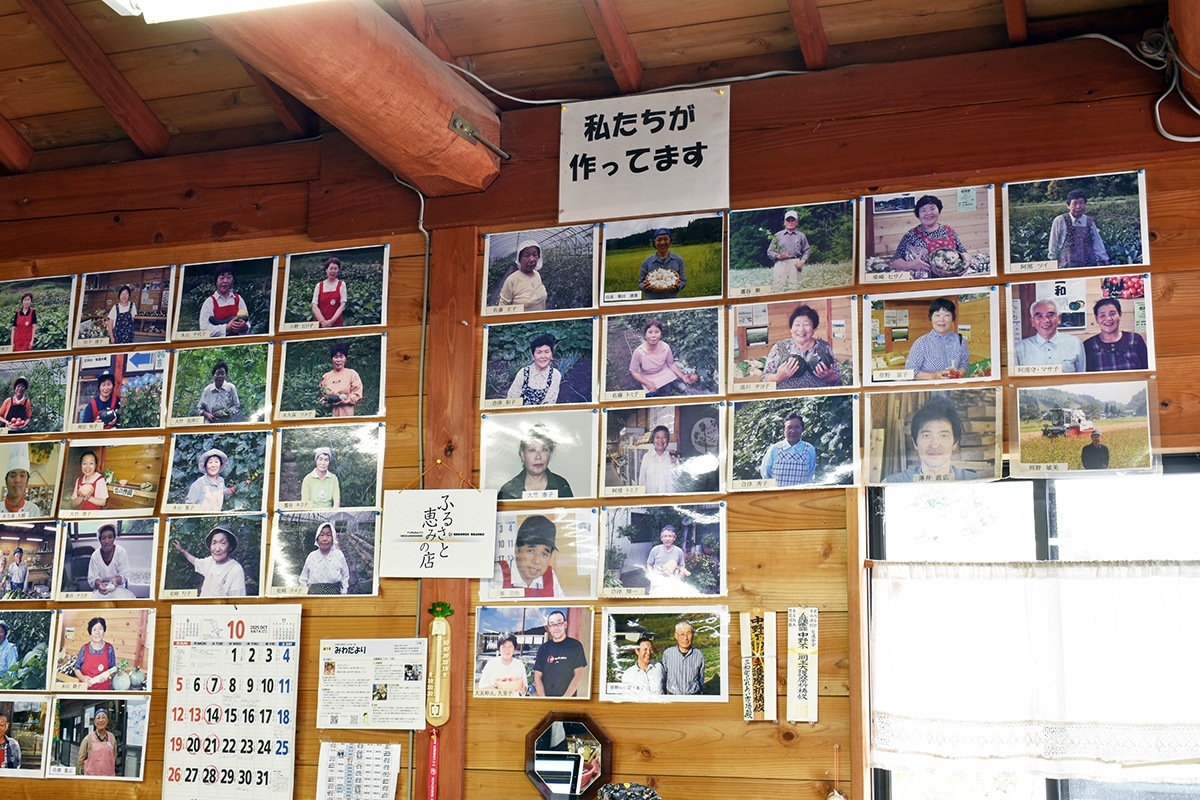 レジの後ろには、商品を納品している生産者さん達の写真がズラリと並んでします。土・日曜日や定休日明けの水曜日には、より多くの野菜が並ぶそうです。